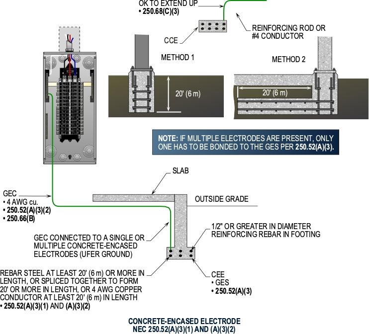 • One or more bare or zinc-galvanized or other electrically conductive coated steal reinforcing bars or rods shall not be less than 1/2 in. (13 mm) in diameter, installed in one continuous 20 ft (6 m) length. If one or more bare or zinc-galvanized or other electrically conductive coated steel reinforcing bars or rods are installed in multiple pieces, they shall be connected together by the usual steel tie wires, exothermic welding, welding, or other effective means to create a 20 ft (6 m) or greater length.